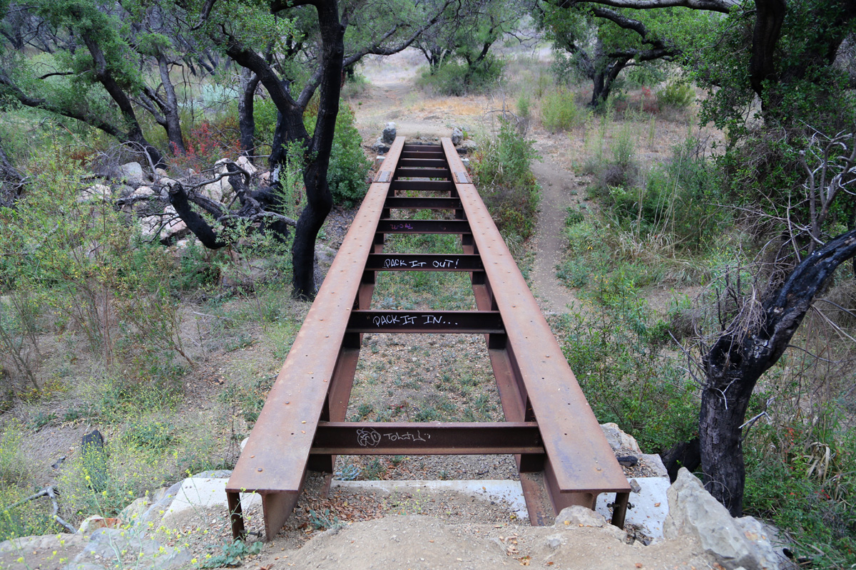나무로 만들었던 상판은 모두 불타서 사라지고, 콘크리트 기단과 H빔 뼈대만 남은 것으로 생각이 된다. 지도에 이 트레일이 니콜라스리지 모터웨이(Nicholas Ridge Mtwy)로 표시되는 것으로 봐서, 아마도 예전에 자동차도 다닐 수 있는 튼튼한 다리를 만들어 놓았었던 모양이다.