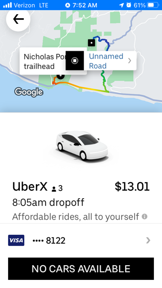 그래서 우버를 찍어봤더니 요금도 13달러밖에 안 나오는데... 'NO CARS AVAILABLE' 근처에 탈 수 있는 차가 없단다. "그래, 이 외진 바닷가에 누가 일요일 아침부터 우버를 뛰고 있겠냐?" 흑흑~