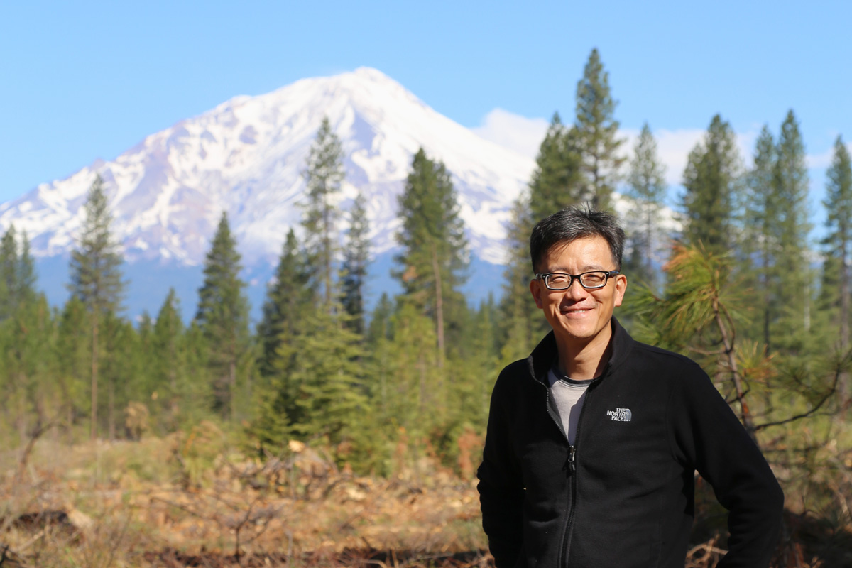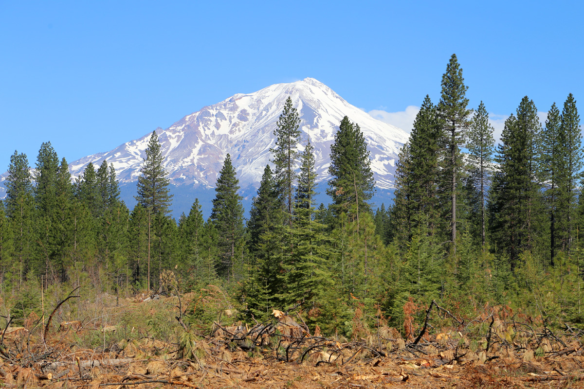 당시 표지판 사진을 못 찍은걸 아쉬워하며 운전을 하고 있는데, 뒤를 힐끔 보던 아내가 빨리 차를 세우라고 했다. 그래서 벌목장으로 들어가는 비포장도로에 차를 세우고 뒤를 돌아봤더니, 이렇게 샤스타 산이 말 그대로 '그림처럼' 그 전체 모습이 눈 앞에 펼쳐졌다.