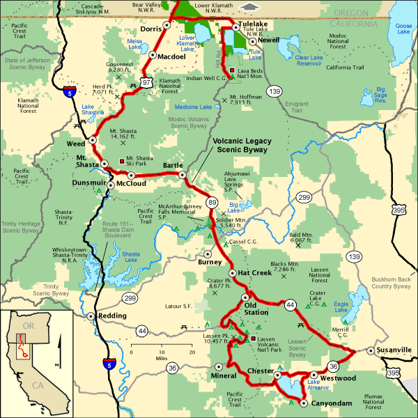 7박8일 북부 캘리포니아 자동차여행의 세쨋날에 둘러본 모든 장소가 위의 지도에 표시되어 있는데, 빨간색으로 표시된 경로가 볼캐닉레거시 시닉바이웨이(Volcanic Legacy Scenic Byway)의 캘리포니아 구간으로 2002년에 올아메리칸로드(All-American Road)로 지정이 되었다. 캘리포니아에는 딱 3개의 AAR이 있는데, 나머지 2곳은 Big Sur Coast Highway 72마일(1996년)과 San Luis Obispo North Coast Byway 57마일(2002년)로 둘 다 캘리포니아 1번 해안도로이다.