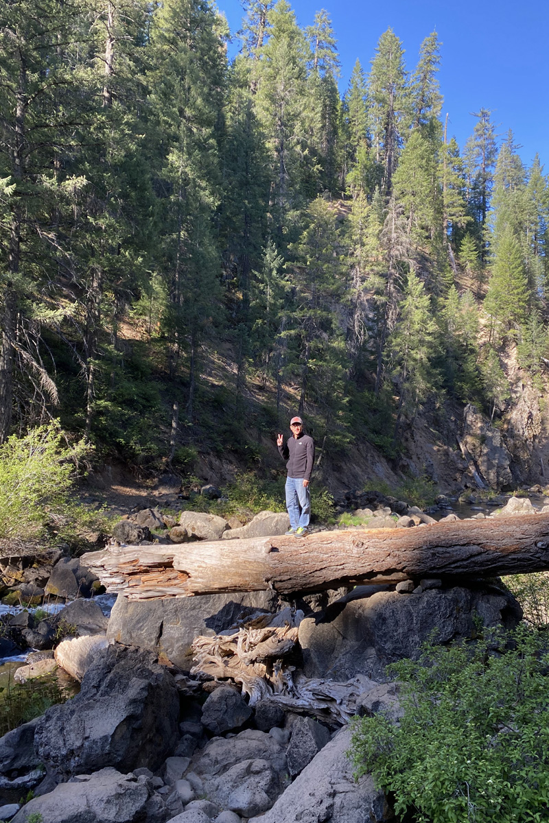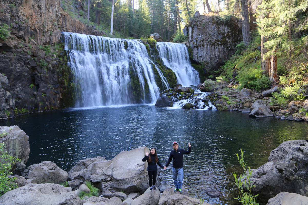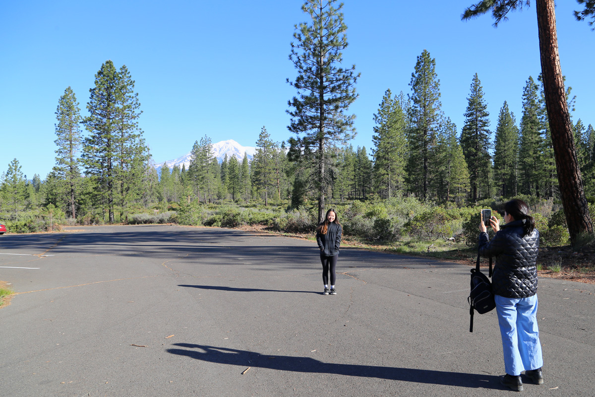 숙박한 마운트샤스타(Mt. Shasta) 마을을 출발해서 89번 도로를 따라 작은 맥클라우드(McCloud) 마을을 지난 후에 구글맵에 'McCloud River - Middle Falls'라 표시된 주차장에 도착했다. (위치를 보시려면 클릭) 넓은 주차장에는 왼쪽에 살짝 보이는 빨간 차를 빼고는 우리 뿐이라서, 멀리 보이는 흰 산을 배경으로 사진찍기 놀이를 하고있다.