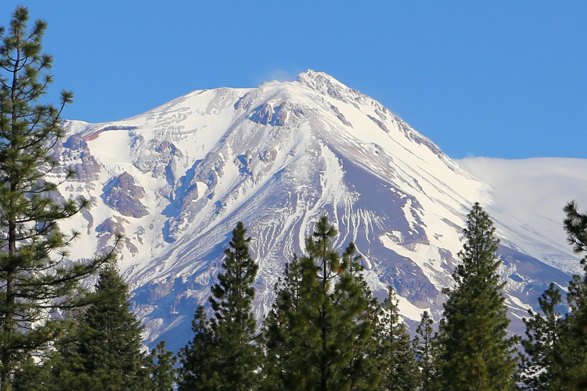 새벽에 남서쪽을 차로 올라갔던 마운트샤스타(Mount Shasta)의 동쪽면이 파란 하늘 아래에 또렷이 보인다. 왼편의 골짜기 Mud Creek Canyon 위에 빙하인 Mud Creek Glacier와 이름의 유래가 궁금한 미저리힐(Misery Hill)이 보이고, 그 오른쪽으로 뾰족한 바위로 된 샤스타 산의 4,322미터 정상이 명확히 보인다.