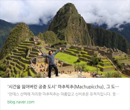 그러고 보니까, 마추픽추는 만리장성, 페트라, 브라질 예수상, 치첸이사, 콜로세움, 타지마할과 함께 2001년에 뉴세븐원더스(New7Wonders)라는 재단(?)에서 온라인 투표로 선정한 '신 세계 7대 불가사의'이다. 이 재단에서 2011년에 제주도가 포함된 '세계 7대 자연경관(New7Wonders of Nature)'의 말 많았던 투표도 주관했었다.