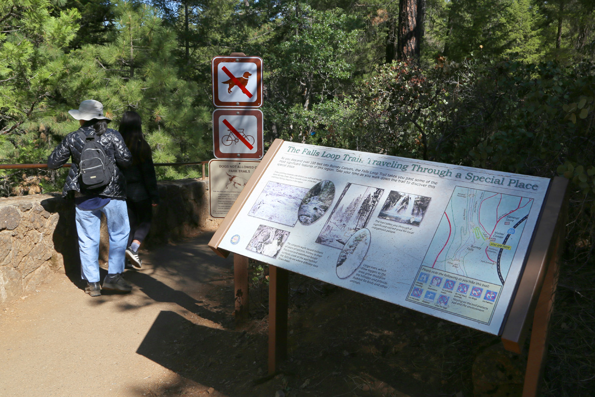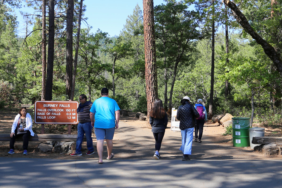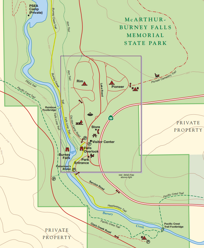 공원지도에 표시된 폭포의 위아래로 Fisherman's Bridge와 Rainbow Footbridge를 건너 한바퀴 도는 Falls Loop Trail을 할까 생각하면서 일단 아래로 내려갔었다. 또 지도에 녹색점선으로 표시된 퍼시픽크레스트트레일(Pacific Crest Trail), PCT가 계곡을 따라서 지나가는 것도 확인하시기 바란다. 참고로 Burney Creek은 북쪽으로 흘러 인공호수인 레이크브리튼(Lake Britton)에서 핏리버(Pit River)와 합류한 후에 댐을 지나서 새크라멘토 강으로 흘러간다.