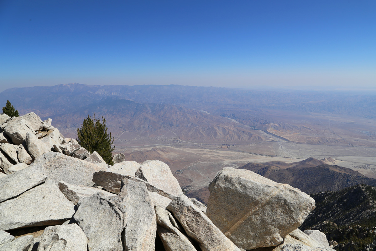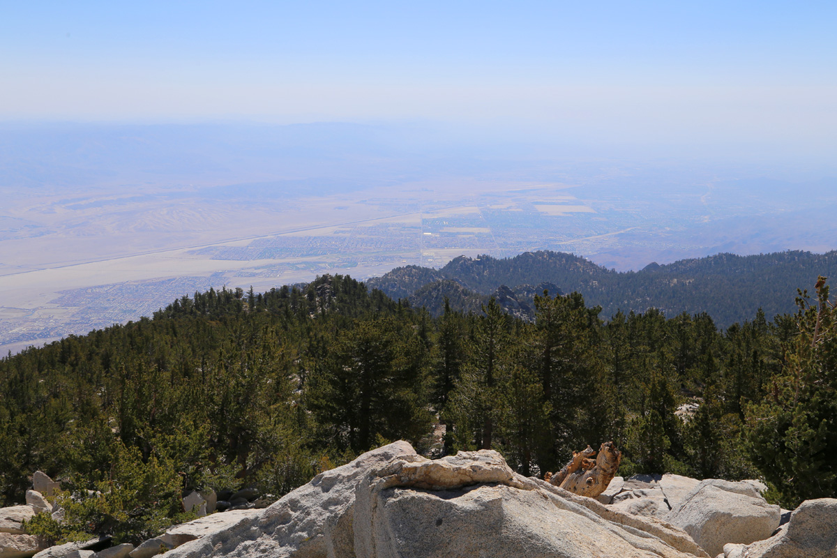 동쪽 아래로는 팜스프링스(Palm Springs) 시내가 바로 아래로 내려다 보이는데, 저 바닥의 해발고도는 200 m 정도밖에 되지 않는다. 그런데 팜스프링스에서 트램을 타지 않고 바닥에서부터 여기 정상까지 걸어서 올라오는 '선인장에서 구름까지' 캑터스투클라우드(Cactus to Clouds, C2C) 트레일이라고 있는데, 편도 26 km를 걸으면서 등반고도가 3,100 m나 되는 한마디로 무지막지한 등산코스이다!