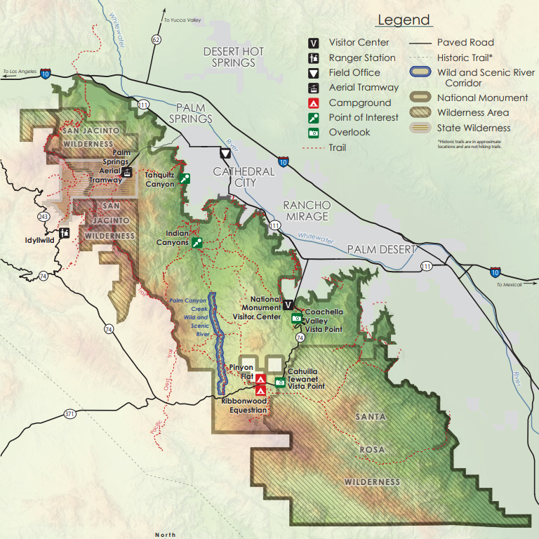 마지막으로 이 등산이 왜 '국립공원 여행기'에 있는지 혹시 궁금하신 분이 계실까봐 알려드리면, 앞서 다른 지도로 보여드린 주립공원이 위에 회색 테두리로 표시된 것을 비롯해서, 위와 같은 영역이 모두 USFS와 BLM이 관리하는 산타로사&샌하신토 산맥 준국립공원(Santa Rosa and San Jacinto Mountains National Monument)으로 2000년에 지정되었기 때문이다. 이 내셔널모뉴먼트에서 샌하신토피크 외에 유명한 곳으로는 지도에 표시된 타퀴츠캐년(Tahquitz Caynon)과 인디언캐년(Indian Canyon), 그리고 락콘서트로 유명한 이름인 코첼라밸리(Coachella Valley)에 있는 비지터센터와 거기서 산맥을 넘어가는 74번 도로 '소나무에서 야자수까지' Pines to Palms Hwy 드라이브 정도인데, 집에서 2시간반 이상 걸리는 곳이라서 모두 아직 가보지를 못했지만, 언젠가는 이 카테고리에 하나둘 추가되기를 기대해 본다~