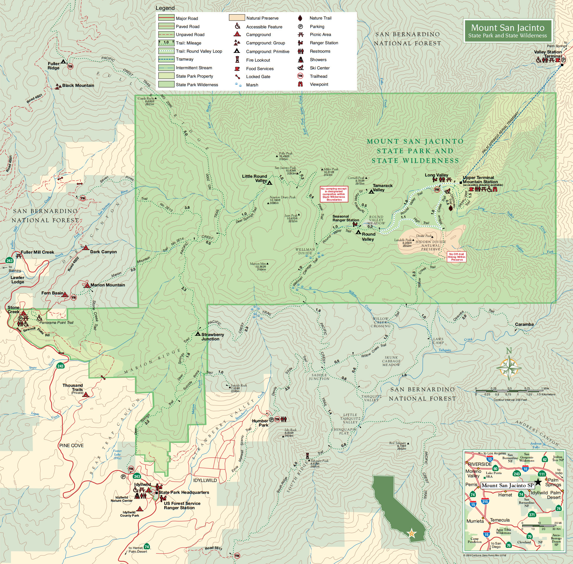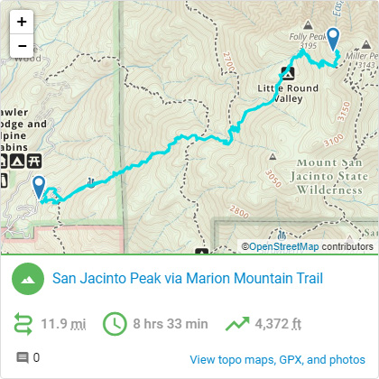 지도 중간의 빨간 사각형 왼쪽 위에 San Jacinto Peak가 있고, 서쪽의 Marion Mountain 캠핑장을 지나는 트레일을 따라서 주립공원 경계에 들어선 것이다. 공원 동쪽에 보면 팜스프링스의 유명한 회전 케이블카인 Palm Springs Aerial Tramway의 정류소가 보이는데, 미국에 이민을 온 직후인 2007년에 이 케이블카를 타고 잠시 주립공원을 방문했던 이야기는 아래를 클릭하시면 보실 수 있다.