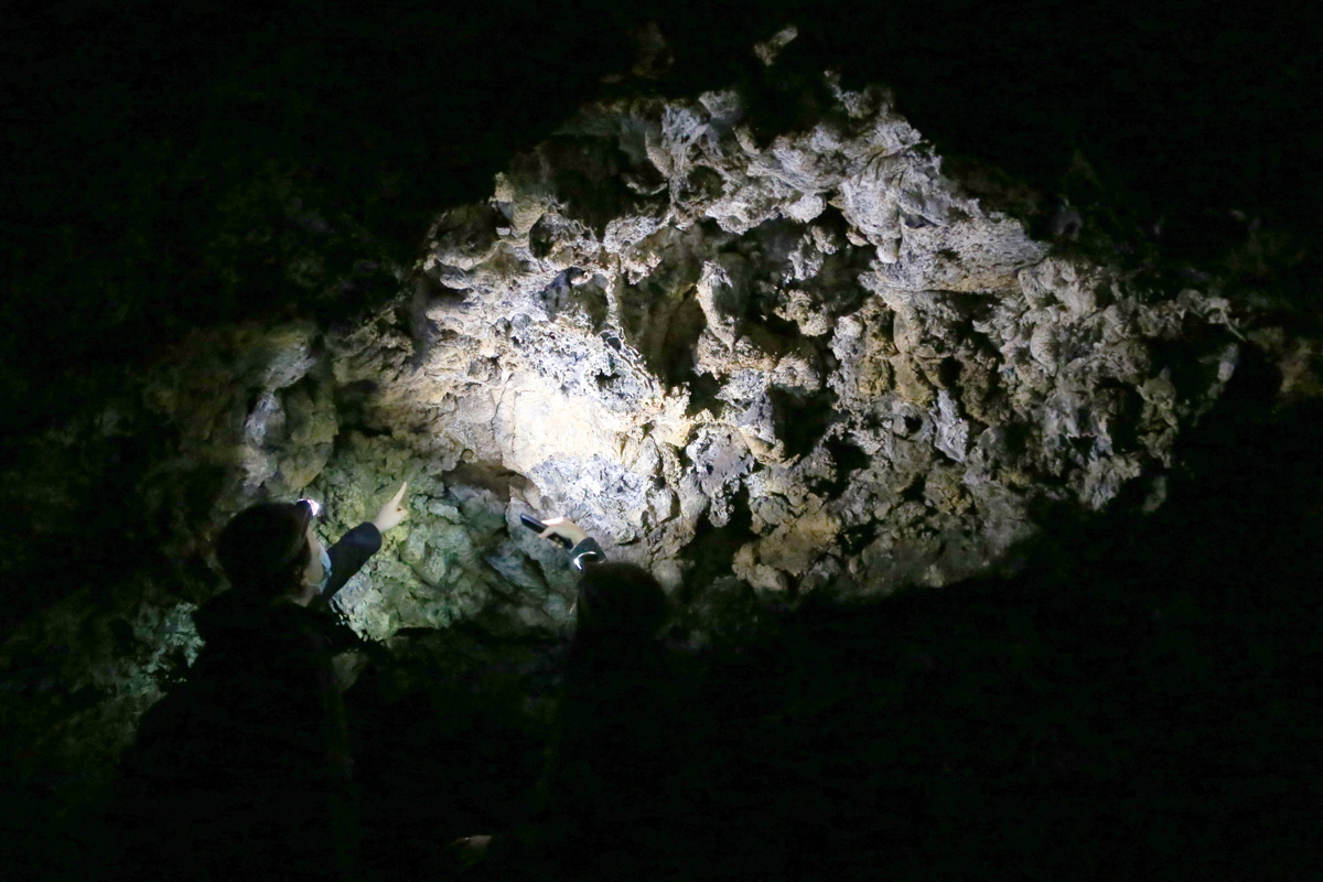 동굴들의 천정에 이렇게 짧고 뾰족하게 굳은 것을 '라바시클(lavacicle)'이라 부르는데, 용암이 튜브를 만들고 흘러간 후에 천정에 남아있던 용암이 아래로 떨어지다 굳은 '용암고드름'이다. 이 사진은 쥬니퍼 동굴의 입구에서 찍었는데, 우리가 허큘레스레그부터 동굴 속으로 지나온 것은 아니고, 그냥 차를 타고 쥬니퍼의 입구로 이동했다.^^