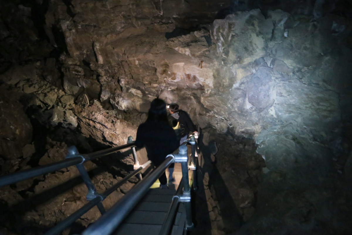 아까 난간이 만들어져 있던 아래층의 라바튜브로 내려가는 마지막 계단이었던 것 같다. "맨 뒤에 걸어가니까, 무서워~"