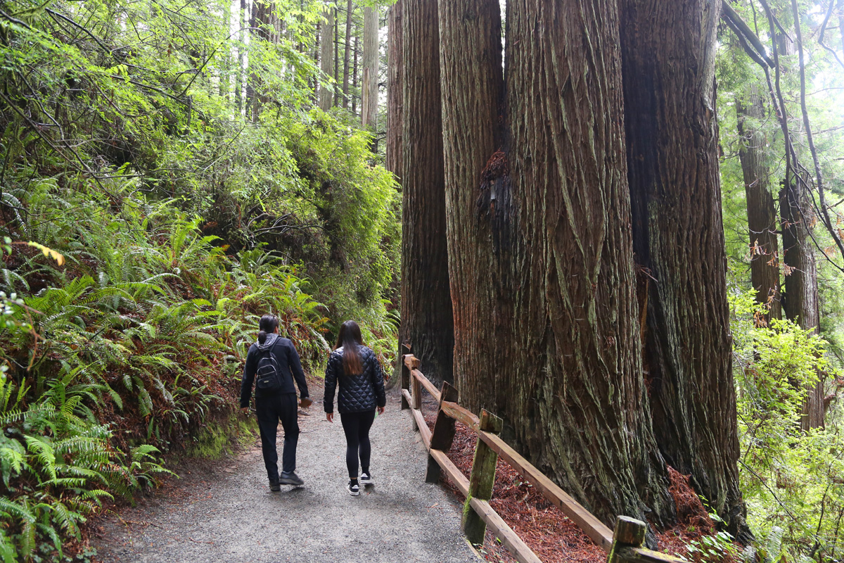 그리고 Forest Experience Trail을 따라 걸어가는데, 오른편의 나무들도 조금 전처럼 여러 그루가 붙어있고, 왼편은 양치식물이 거의 벽을 이루고 있었다. 진입로가 비포장이라서 여행계획에서 제외했던, 영화 <쥬라기공원>의 촬영지로 유명한 펀캐년(Fern Canyon)을 못 간 아쉬움이 조금은 달래졌다.