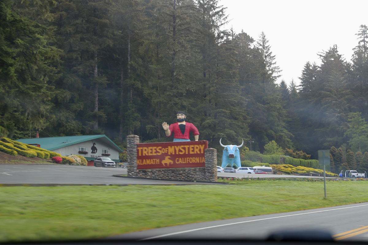 주립공원의 경계를 벗어나자마자 '트리스 오브 미스테리(Trees of Mystery)' 간판과 사람과 소를 커다랗게 만들어 세워놓은 것이 보인다. (당연히 국립공원과 주립공원 지도에는 표시가 없음. 구글맵으로 정확한 위치를 보시려면 여기를 클릭) 아침 8시 개장시간에 거의 맞춰서 도착을 했는데, 벌써 차들이 제법 많이 있는 것이 보인다.