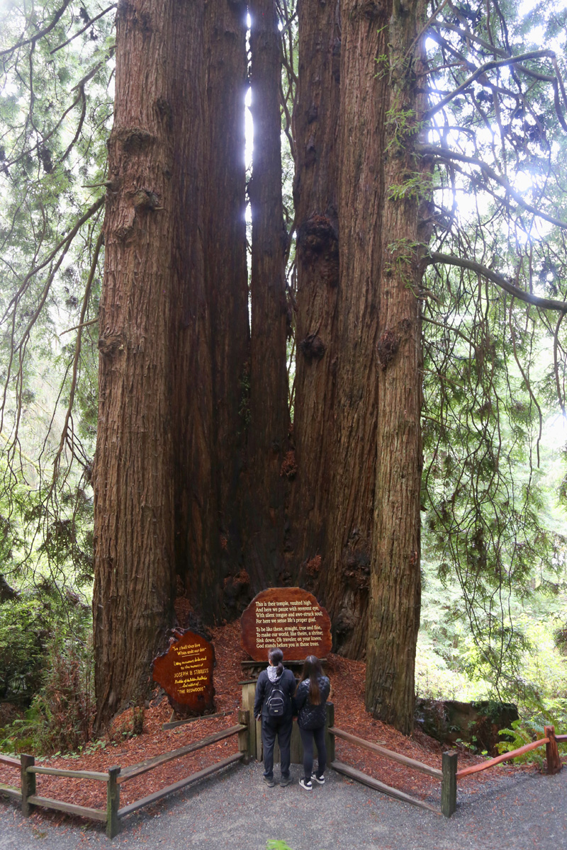 땅으로 내려와 처음 만나는 나무는 Cathedral Tree로 아홉그루의 레드우드가 붙어서 반원형을 이루며 솟아있다. 저 바닥 맞은편과 여기 언덕에도 벤치가 만들어져 있어서, 결혼식 등의 행사가 열리는 장소로 이용된다고 한다.