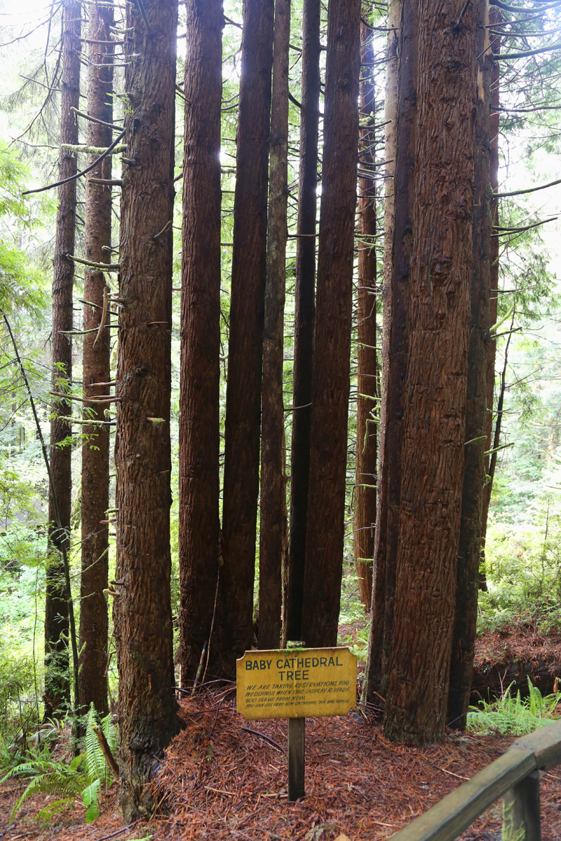 전편에서 예식장으로 사용된다는 캐서드럴트리를 보여드렸었는데, 아직 어린 레드우드들이 비슷한 모습으로 자라고 있는 Baby Cathedral Tree가 있었다. 안내판에는 여기도 예식장 예약을 받고 있는데, 600년 후부터 이용이 가능하다고 한다.^^