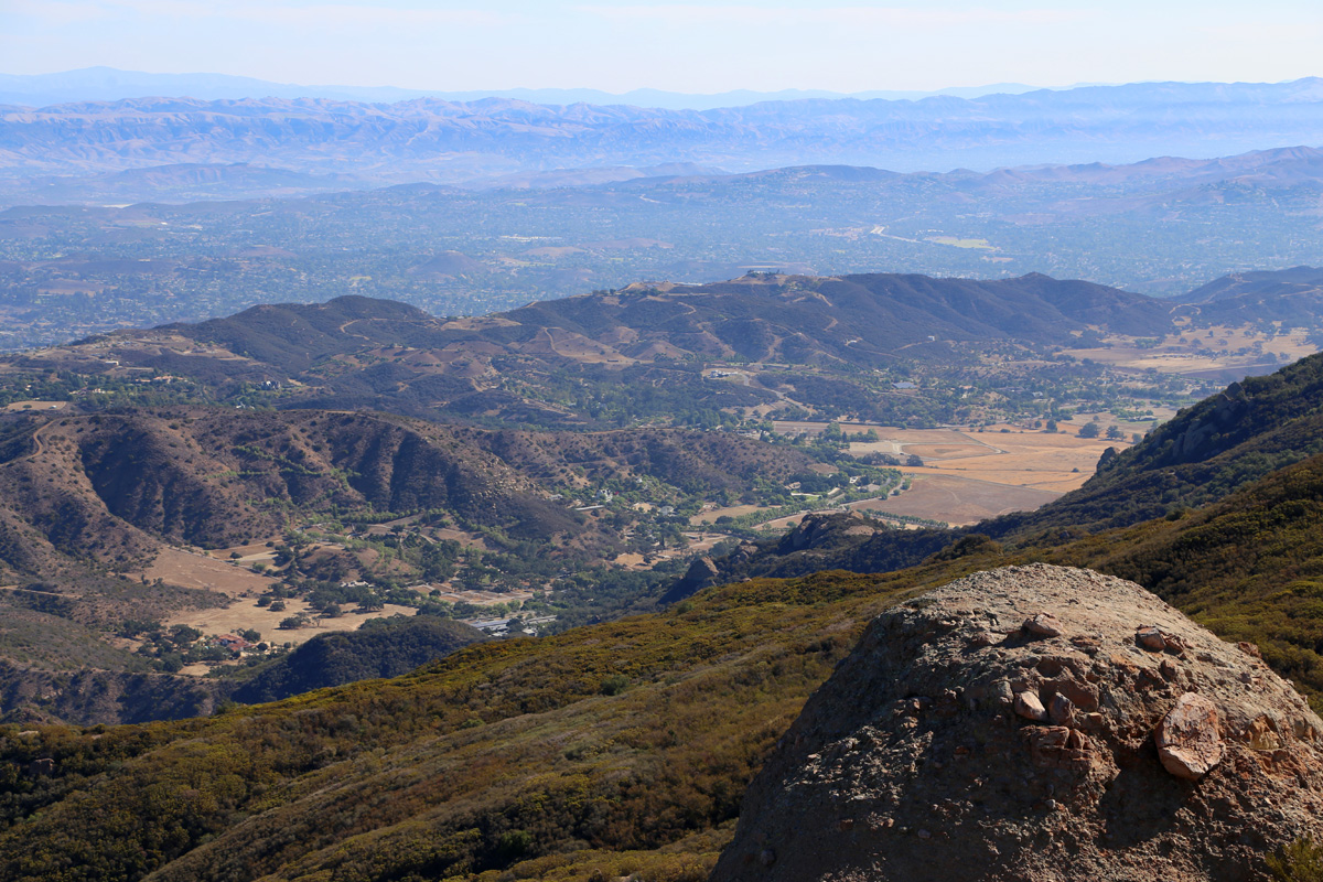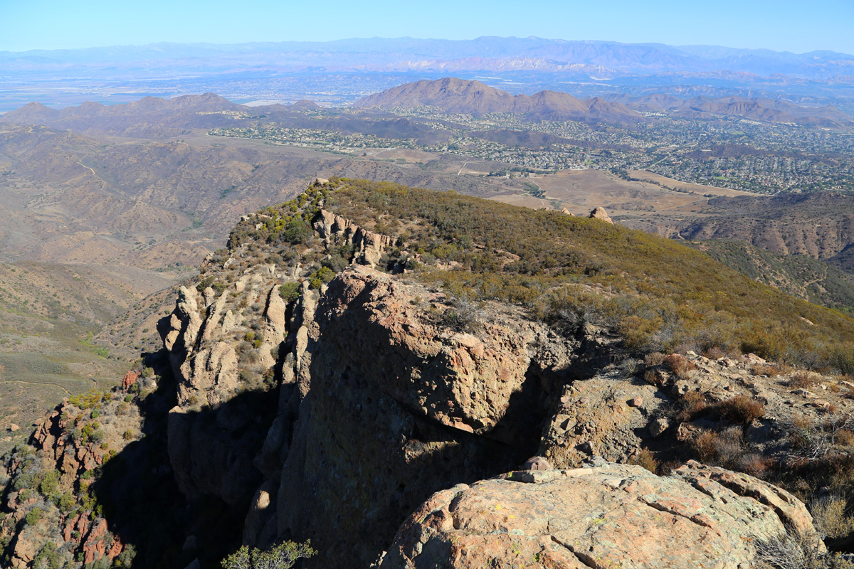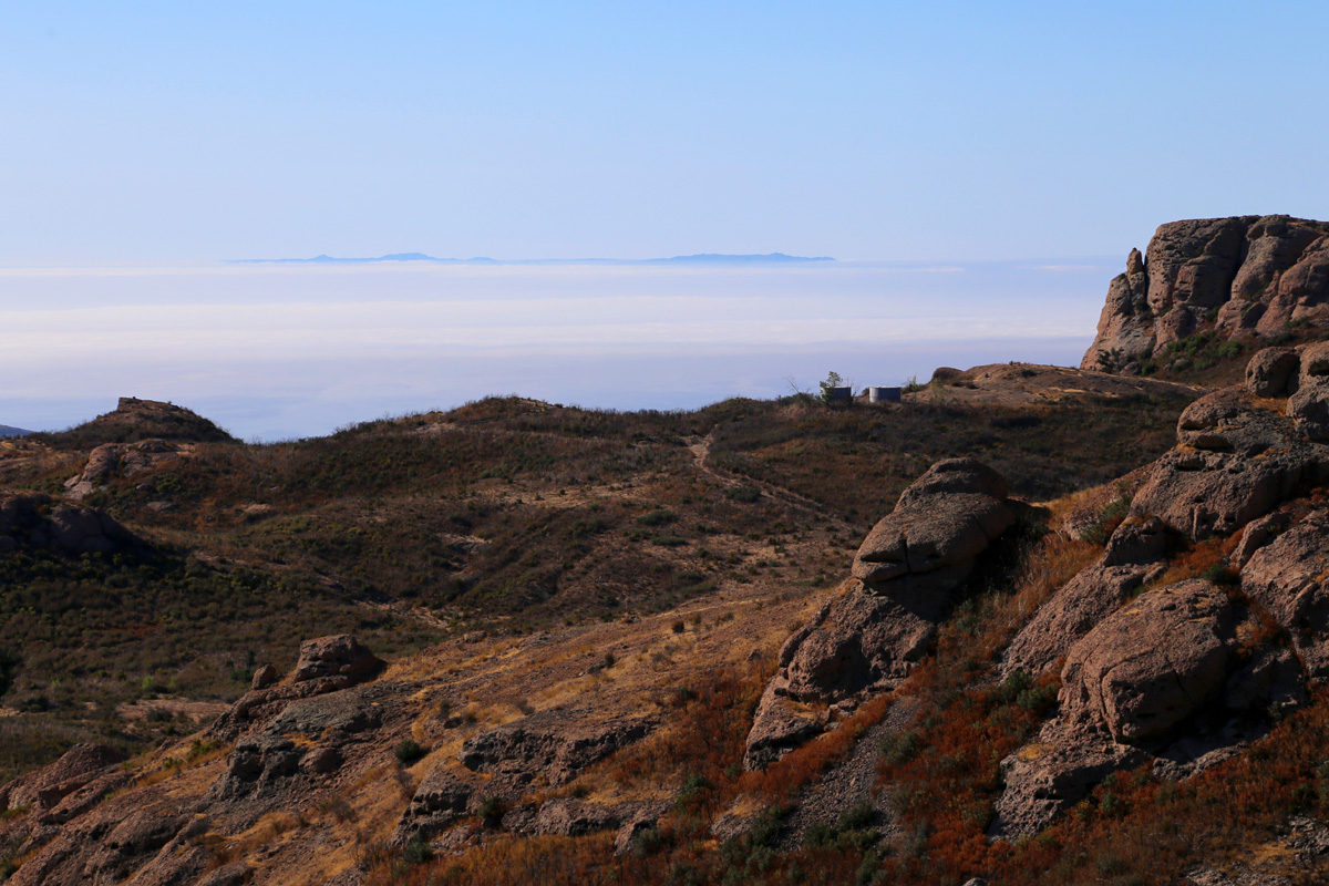 남동쪽으로는 아직 걷히지 않은 바다안개 위로 카탈리나 섬(Catalina Island)이 솟아있는데, 우리 가족 3명이 각각은 다 가봤지만 함께 가본적은 없는 특이한 기록을 가진 여행지이다.^^ 그리고 오른쪽의 바위절벽은 익스체인지피크(Exchange Peak)라는 이상한 이름의 봉우리로 지금 서있는 곳과 정확히 같은 높이인 해발 2953피트(900 m)로 공식적으로 산타모니카 산맥에서 3번째로 높은 봉우리이다.