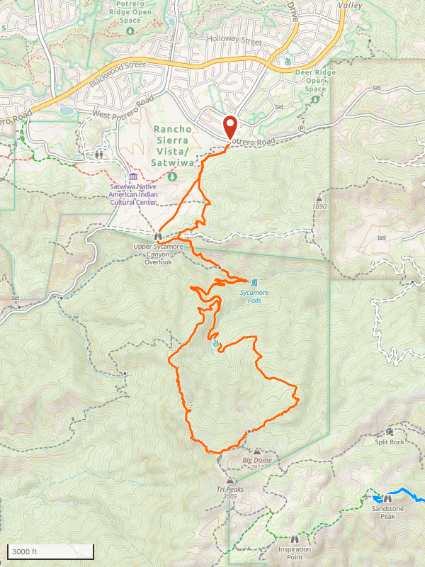 가이아GPS로 기록한 이 날 하이킹 경로로 전체거리는 약 9마일에 휴식시간 포함 6시간이 소요되었다. 협곡에는 Sycamore Falls로 표시된 폭포가 있다지만 가보지는 않았고, 작은 언덕을 지그재그로 넘은 다음에 나오는 루프를 시계방향으로 돌았는데, 경로상에 정상이 표시되어있지 않은 이유는 나중에 알려드리기로 한다. 지도 오른쪽 아래에 별도의 파란 경로상에 표시된 샌드스톤피크(Sandstone Peak)는 해발 3111피트(948 m)로 산타모니카 산맥에서 가장 높은 봉우리인데, 여기를 클릭해서 5년전 '쌀포대를 지고 올라갔던' 산행기를 보실 수 있다.