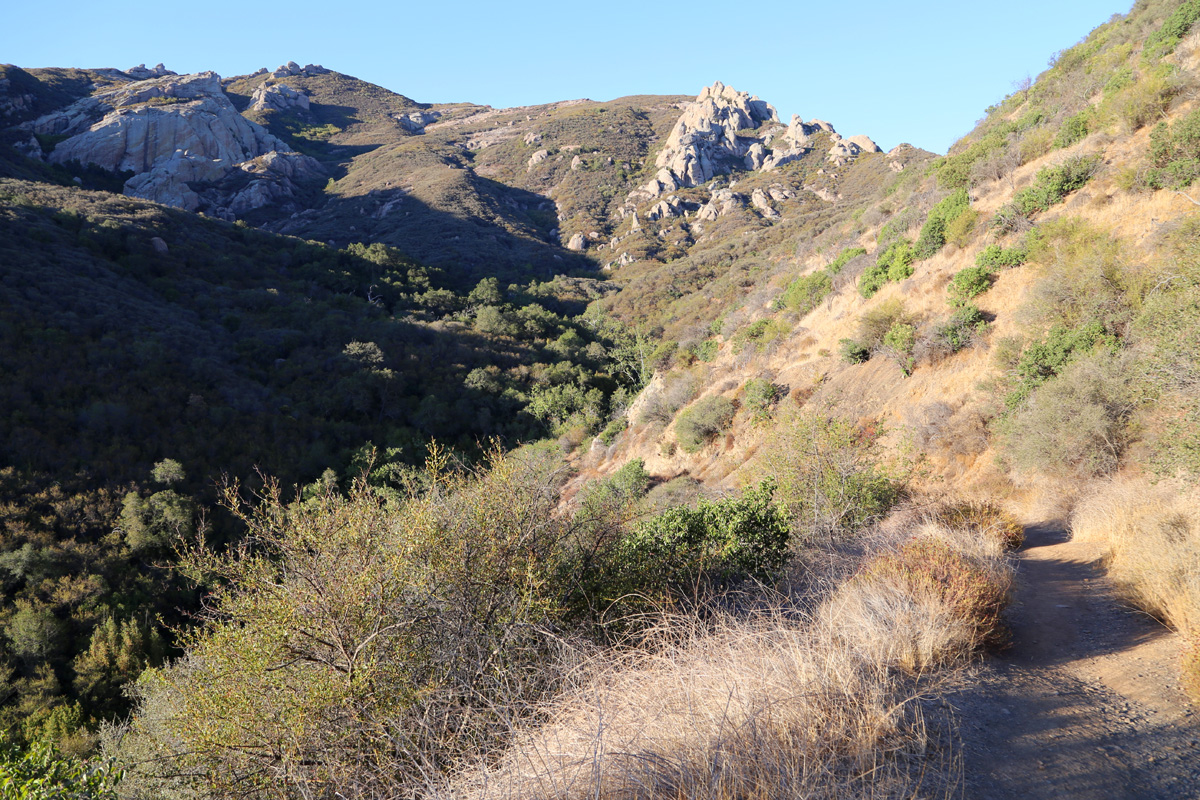 초원이 끝나는 곳에서 Old Cabin Tral을 따라 조금 남쪽으로 내려가면 Upper Sycamore Canyon Overlook 전망대가 나온다. 사진 가운데 푸른 나무들이 보이는 빅시카모어캐년(Big Sycamore Canyon)은 여기서부터 약 8마일을 흘러서, 지난 주에 다녀왔던 시카모어코브(Sycamore Cove)에서 태평양과 만난다.