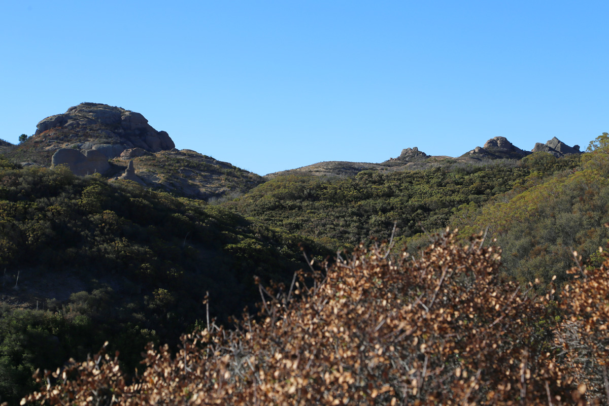 그렇게 힘들게 주능선까지 올라오면 남쪽으로 트레일맵에 표시되어 있던 왼편의 빅돔(Big Dome, 2912피트)과 오른편의 트라이피크(Tri Peaks, 3009피트)가 눈에 들어오는데, 산타모니카 산맥에서 2번째로 높은 봉우리이다.