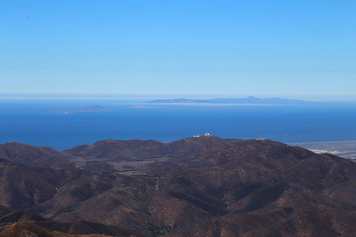 바로 전주에 저 바닷가 언덕에 올라서도 구름 때문에 보이지 않았던 채널아일랜드(Channel Islands) 국립공원의 섬들이 서쪽에 또렷이 보인다. 왼쪽의 작은 섬이 2012년에 우리 가족이 방문했던 아나카파(Anacapa)고 (여행기를 보시려면 클릭), 가운데 큰 섬이 산타크루즈(Santa Cruz)로 그 뒤에 산타로사(Santa Rosa)와 샌미구엘(San Miguel)의 두 섬이 가려져 있는데, 추마시 원주민들은 바다를 건너서 저 섬들에도 마을을 만들었다고 한다. 그리고 앞쪽에 하얀 시설물들은 산타모니카 산맥의 가장 서쪽에 있는 봉우리인 라구나피크(Laguna Paek, 1421피트) 정상에서 미해군이 운영하는 위성추적기지(Satellite Tracking Station)이다.