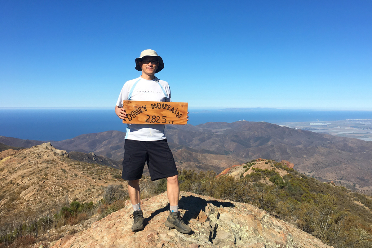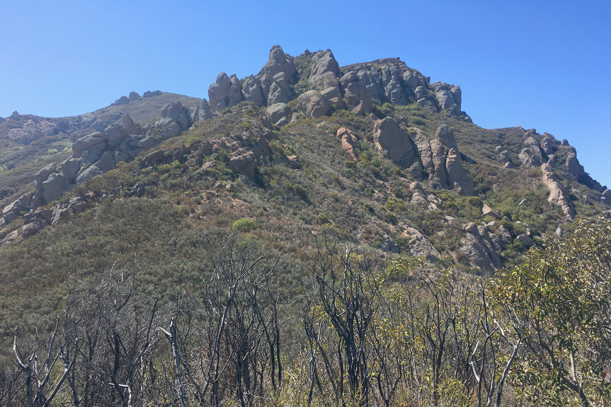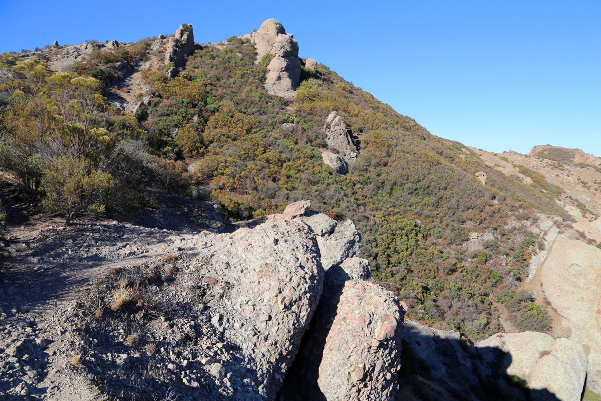 그리고 작은 언덕을 하나 넘으면 나타나는 가운데 동그란 바위가 마운트보니피크(Mt Boney Peak) 정상이다. 문제는 구글맵과 위키피디아에서 Boney Peak 또는 Boney Mountain으로 검색하면 나오는 곳은 산맥의 최고봉인 샌드스톤피크 바로 서쪽에 있는 해발 2825피트의 다른 바위산이다. 트레일앱에 따르면 저 바위 꼭대기는 해발 2953피트(900 m)로 더 높은데도 이름을 빼앗긴 이유는 바로 남쪽에 붙어있는 3009피트의 Tri Peaks 때문에 지리적으로는 별도의 봉우리로 인정되지 않아서다. (구글맵으로 위치를 보시려면 클릭)