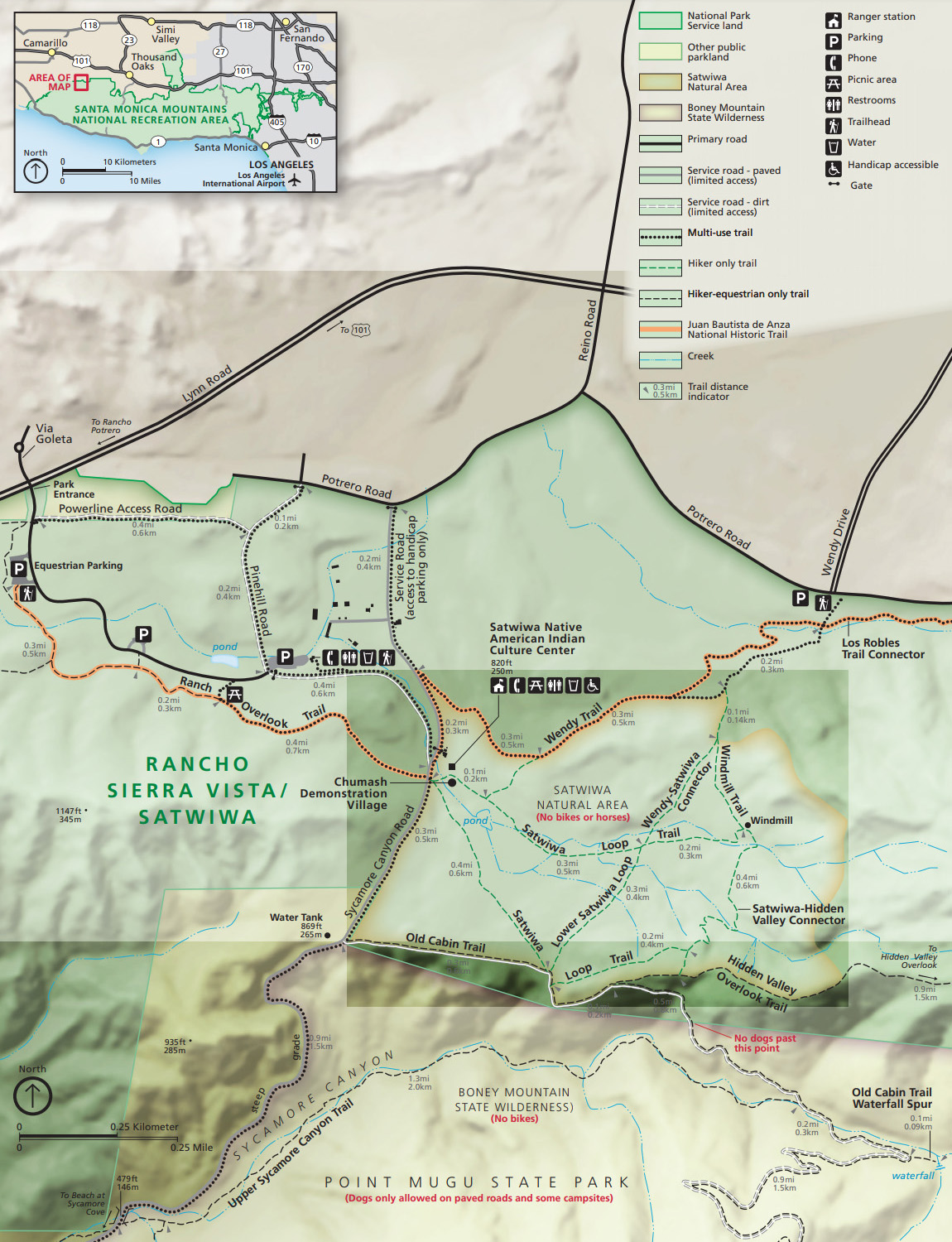 산타모니카마운틴 국립휴양지에 속하고 미국 국립공원청(National Park Service)이 직접 관리하는 랜초시에라비스타/샛위와(Rancho Sierra Vista/Satwiwa) 구역의 지도로, 위기주부가 주차한 곳은 가장 오른쪽에 표시되어 있다. 이 땅에서 1만년 전부터 거주한 것으로 추정되는 추마시 부족은 이 곳을 그들의 언어로 '샛위와(Satwiwa)'라고 불렀는데, 그 뜻은 "절벽들(the bluffs)"로 이제 그들이 신성히 여겼다는 바위절벽의 꼭대기로 올라간다.