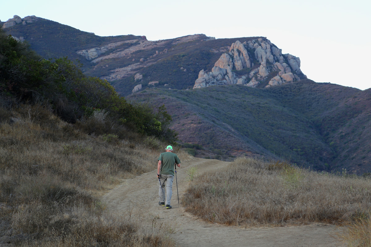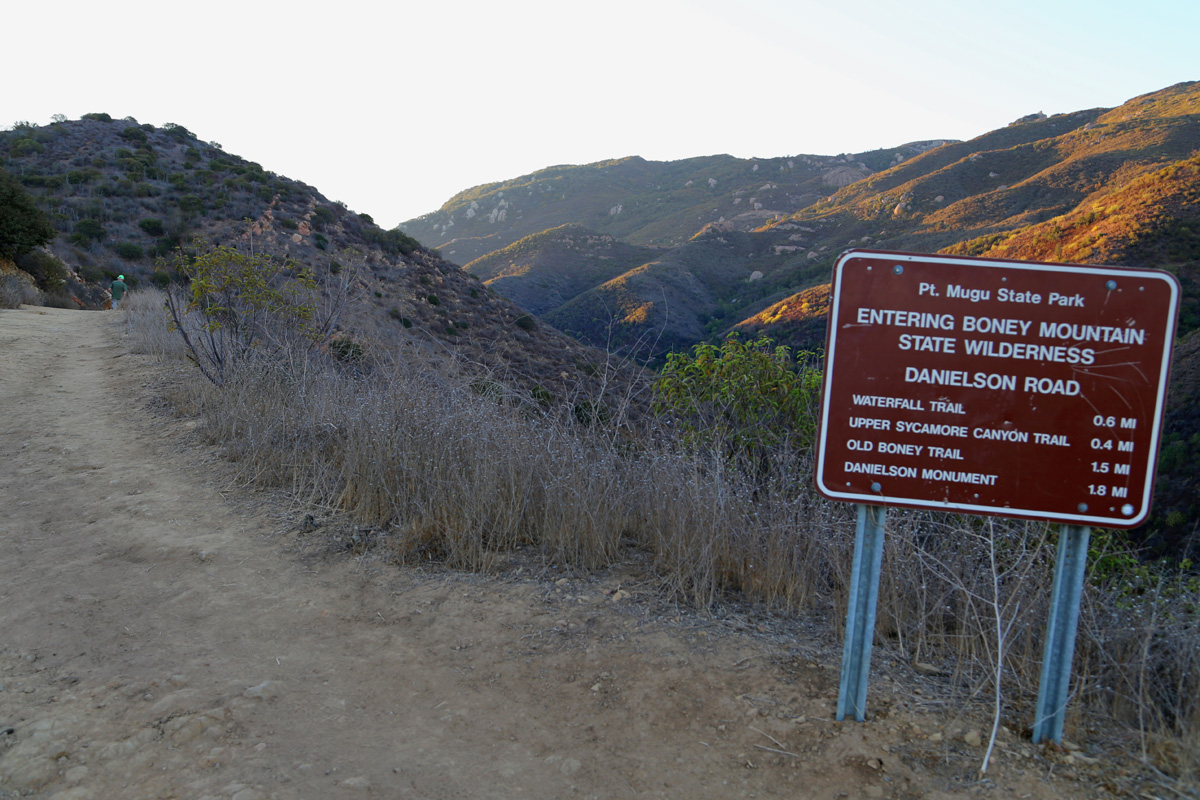 상류쪽으로 방향을 틀어 협곡으로 내려가는 다니엘슨로드(Danielson Road)로 접어들면 포인트무구 주립공원(Point Mugu State Park)에 들어서는 것이다. 산책하시던 분이 다른 길로 와서 저 앞에 먼저 내려가고 계시다~
