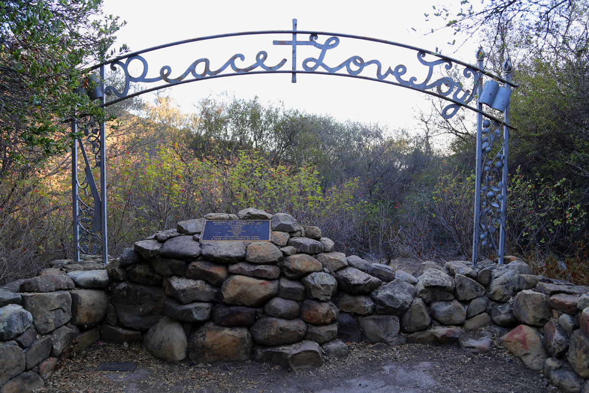 그 모뉴먼트는 다름 아니라 Richard Ely Danielson의 묘지였다. 그는 LA 부근에서 가장 오래까지 옛모습의 대규모 농장으로 유지된 랜초시에라비스타(Rancho Sierra Vista)의 마지막 주인으로, 1970년대초 5,585에이커의 땅을 캘리포니아에 기증해서 포인트무구 주립공원이 되게 했고, 1980년에 처음 공원지도로 보여드린 나머지 850에이커도 국립공원청에 매각해서 국립휴양지가 되게 했단다. 박수 짝짝~ 그런데 십자가와 "Peace, Love, Joy"로 장식된 아치의 왼편 기둥에 엽총이 새겨져 있는 것이 상당히 특이한 느낌이었다.