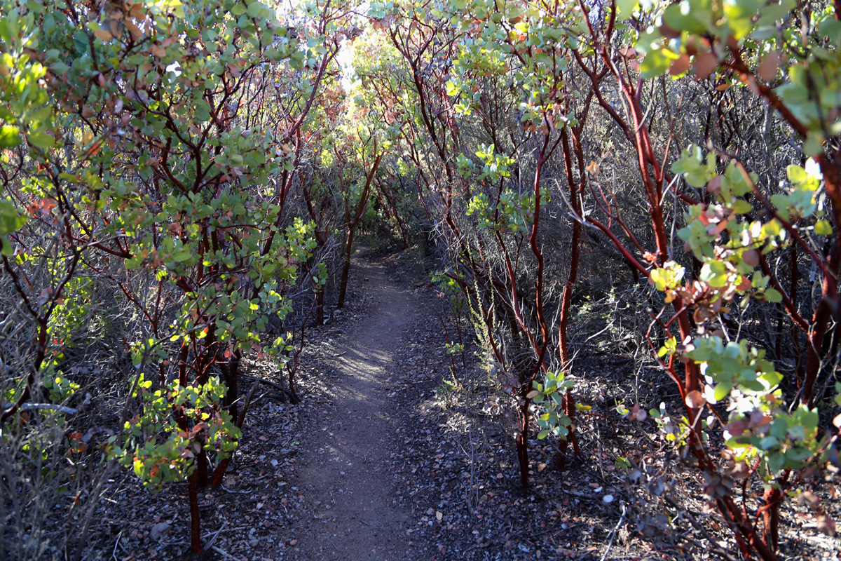 가지가 붉은 만자니타(Manzanita)라는 나무는 철쭉의 일종이라고 하는데, 이 등산로는 사람들이 자주 다니지 않아 굵은 가지들이 길을 막고있는 경우가 많아서, 팔과 얼굴이 긁히는 것을 조심해야 했다.