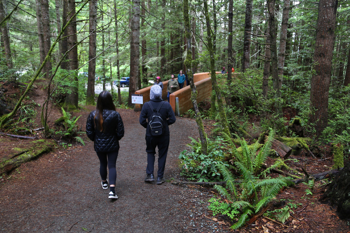 트레일은 주차장 입구 반대편에서 시작되는데, 나무들 사이로 걸쳐져 있는 것은 쓰러진 나무가 아니라, 거대한 통나무 난간의 보행자 전용 다리이다.