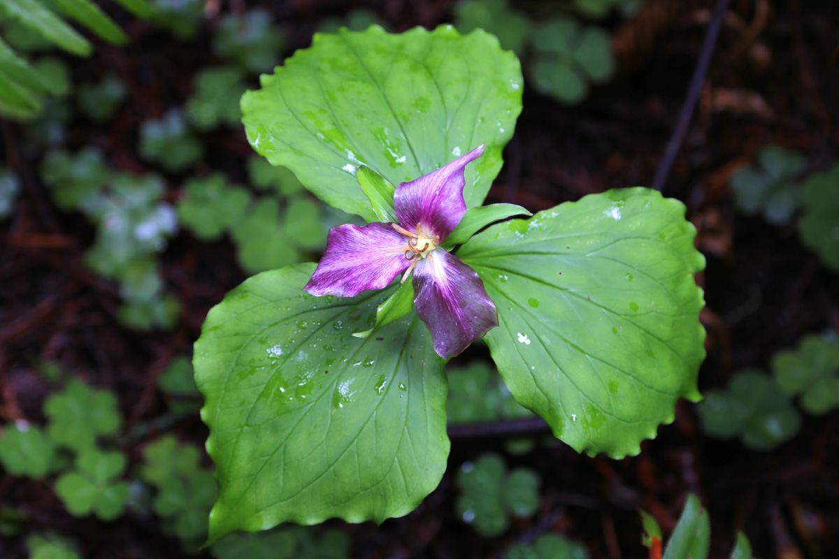 길 좌우로 이 꽃들을 찾으며 즐겁게 걸었는데, 이 건 조금 색깔이 연한 품종이었다. 트릴리움은 한국어로 연령초(延齡草, 연영초)라고 하는데, 약으로 쓰면 '나이(齡)가 늘어난다(延)'는 뜻으로 진시황이 찾던 불로초라는 전설도 있지만, 실제 한방에서 대단한 효능이 있는 것은 아니란다. 어제는 만병을 치유한다는 만병초, 오늘은 수명을 연장한다는 연령초... 그냥 이런 꽃들과 나무의 정기를 받으며 걷는 것만으로도 만병통치 장수무강 힐링이 될 것 같은 대단한 레드우드 숲이다.