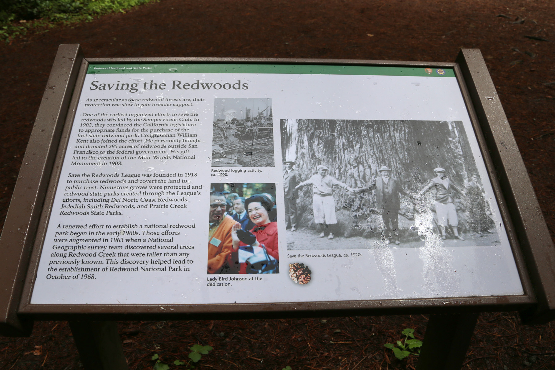 레드우드 나무 보존의 역사에 대한 설명과 가운데 국립공원 지정식에 참석해 웃고 있는 Claudia Alta "Lady Bird" Johnson, 즉 당시 영부인의 컬러사진이 있다. 그녀는 1963년에 케네디 대통령의 암살로 영부인이 된 후부터 "Where flowers bloom, so does hope."라는 유명한 말과 함께 미국의 미화(beautification)와 자연보호에 앞장서서 많은 활동을 했다고 한다.