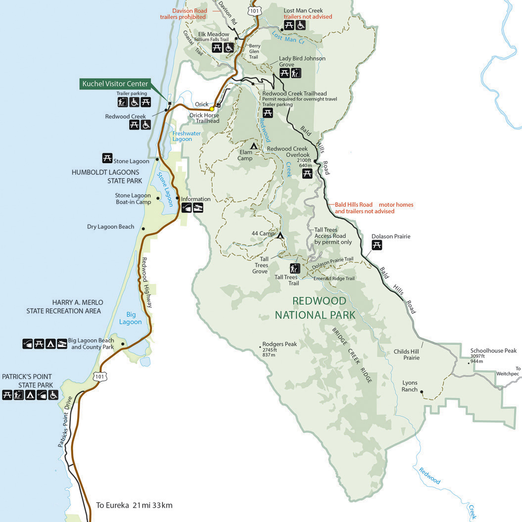 우리의 트레일이 시작되는 곳은 지도의 갈색 101번 국도에서 까만색 Bald Hills Road를 따라서 언덕을 지그재그로 조금만 올라가면 나오는 레이디버드존슨그로브(Lady Bird Johnson Grove)라는 곳이다. (구글맵으로 위치를 보시려면 클릭)