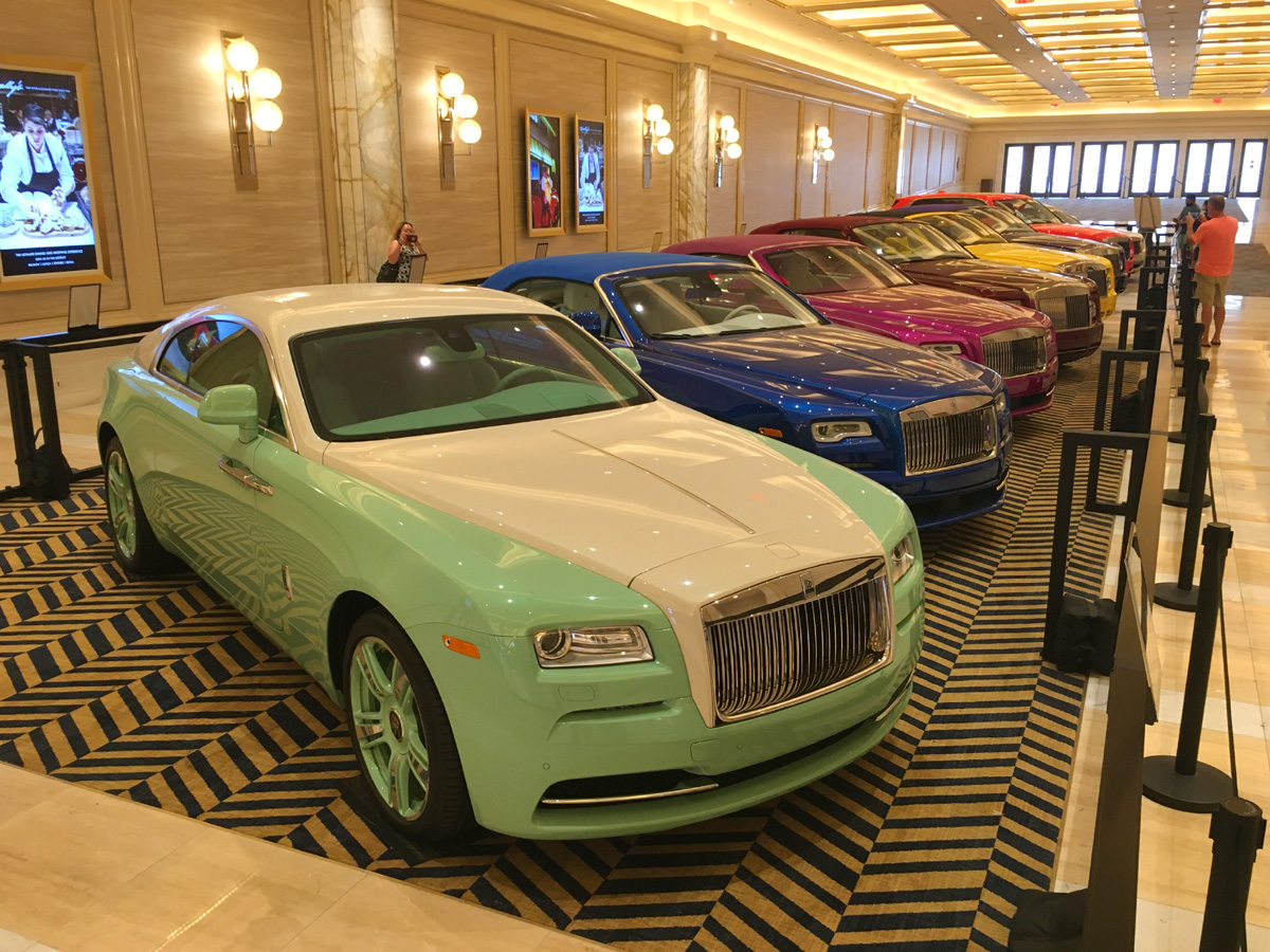 주차장에서 호텔로 연결된 통로로 들어서면 제일 먼저 눈에 띄는 것은 특별한 색깔의 롤스로이스 자동차들이다. (구글맵으로 리조트월드 위치를 보시려면 클릭) Michael Fux라는 개인수집가의 컬렉션인데 모두 특별주문한 색깔들이고, 다른 사람이 전시된 차량과 같은 색깔의 롤스로이스를 구매하려면 마이클의 허가를 받아야 한단다.