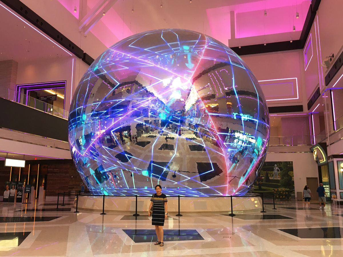 위의 짧은 동영상을 클릭해서 보시면 커다란 물고기가 공의 표면을 따라 지나가는 것을 볼 수 있다. 위키피디아에 따르면 삼각형의 LED 패널 8,640개를 이어붙여서 만든 세계최대의 구형 디스플레이라고 한다.