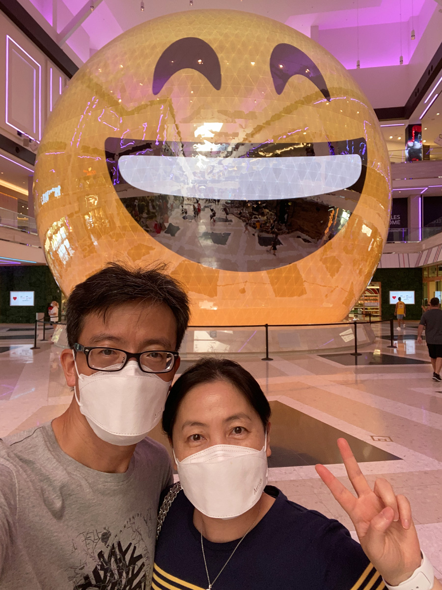 글로브 앞에서 셀카를 찍을 때 "스마일"하고 크게 외지면, 글로브가 웃는 이모티콘으로 바뀐다...는 것은 뻥이고~^^ 그냥 커플셀카를 찍는 순간에 저렇게 완벽한 구도로 딱 😃이 화면에 나와줬다.