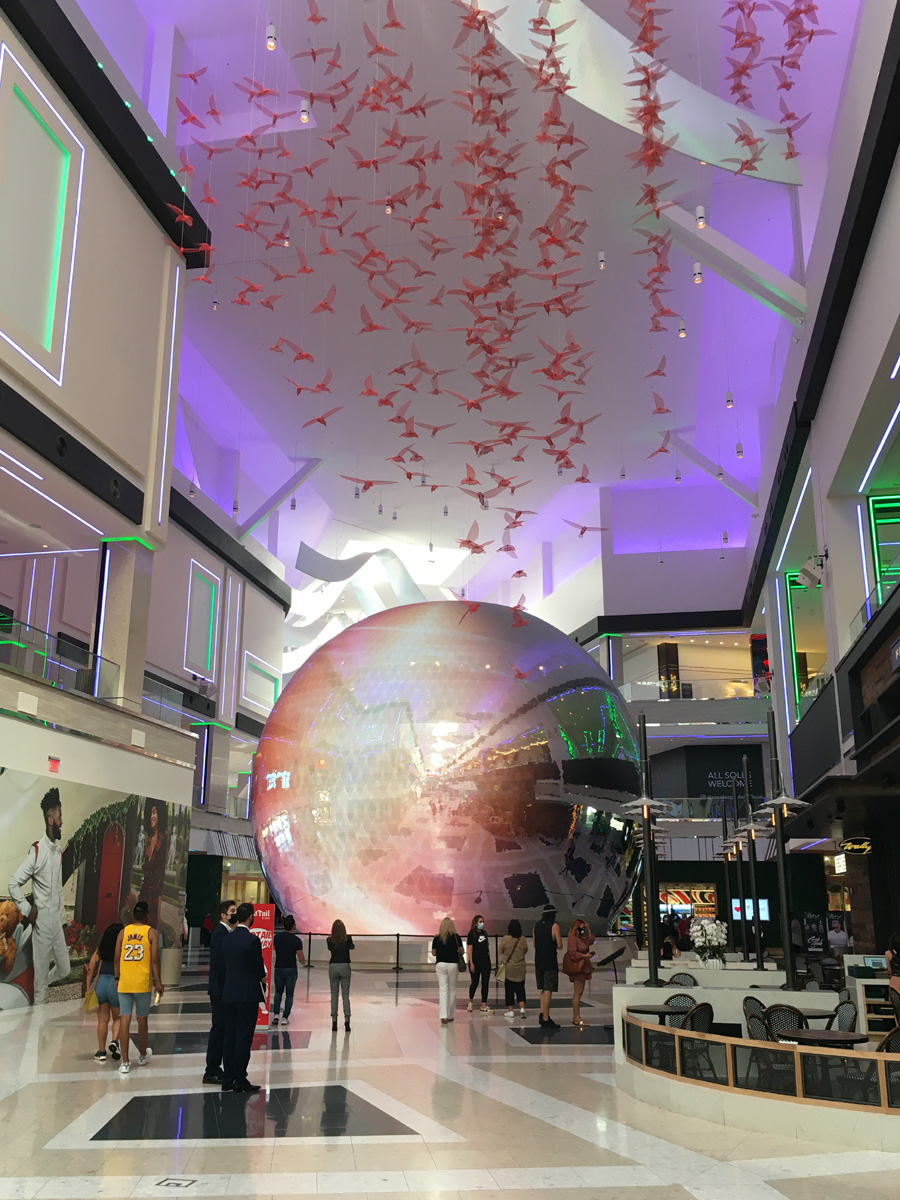 리조트월드에서 가장 유명한 볼거리를 찾아서 쇼핑몰로 왔는데, 아직 가게들이 다 들어오지는 않아서 약간은 썰렁한 분위기였다. 빨간 종이학(?)들이 매달린 아래로 빛나는 저 구체가 이 곳에서 제일 핫한 '더글로브(The Globe)'인데,