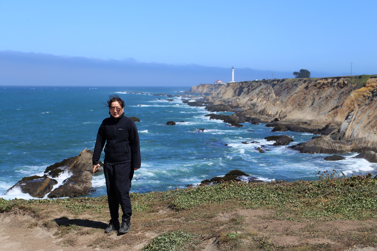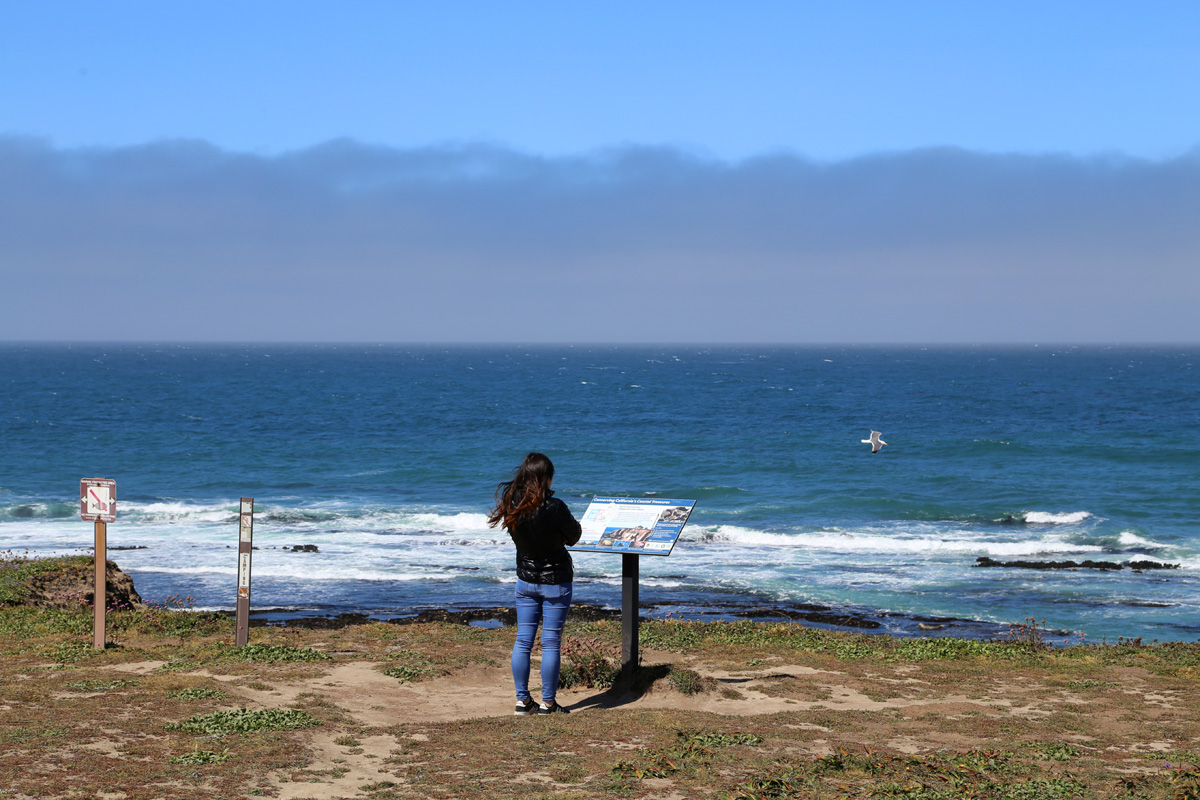 그래서 게이트에서 돌려서 나오다가 도로변에 차를 세웠다. 지혜는 긴 머리칼을 바람에 휘날리며 등대 서쪽의 바다가 주립해양보호구역(State Marine Conservation Area, SMCA)으로 지정되어 있다는 안내판을 보고 있고,