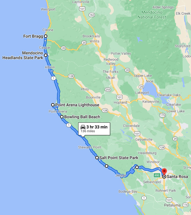 벌써 3개월이나 흘러간 지난 5월말의 북부 캘리포니아 7박8일 자동차여행의 6일째 여행기가 시작된다. 이 날은 포트브래그(Fort Bragg)에서 출발해서 남쪽으로 해안가를 따라 약 220 km 드라이브를 한 후에 소노마밸리의 중심도시인 산타로사(Santa Rosa)에 도착해서 숙박했다. 문제는 그 사이의 왠만한 골짜기는 다 주립공원이고 눈에 보이는 바닷가는 다 주립해안이라서, 그 중에서 어디에 차를 세우고 구경을 해야 할 지 고르는 것이 어려운 문제였다는 것이다.