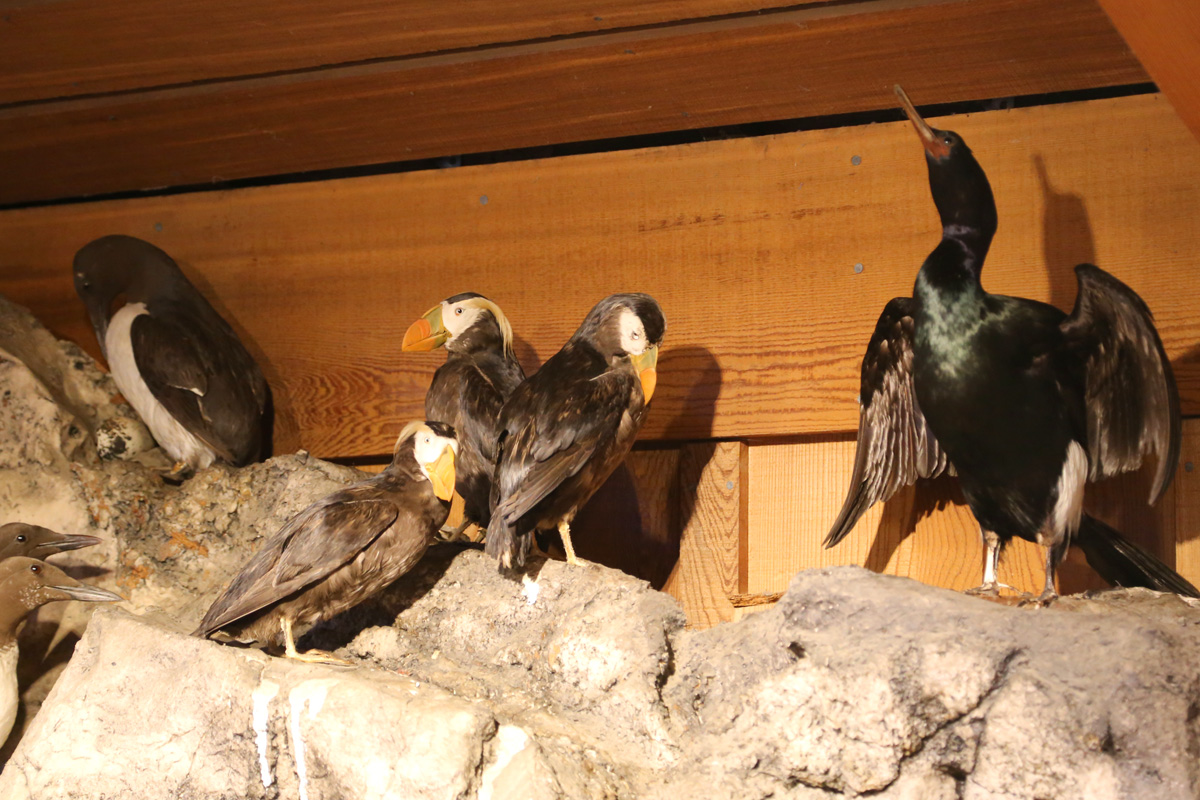 전시장 벽면의 바위 위에는 주황색 부리의 퍼핀(puffin)을 비롯한 바다새들이 가득하고,