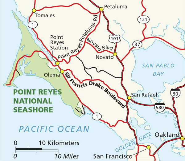포인트레예스 내셔널시쇼어(Point Reyes National Seashore)는 위의 지도처럼 샌프란시스코 북쪽에 위치하는데, 단순히 바닷가 일부가 아니라 굉장히 넓은 면적임을 알 수 있다. 전날 101번 고속도로 위쪽의 산타로사(Santa Rosa)에서 숙박한 우리는 지도에 표시된 페탈루마(Petaluma)까지 내려와서 브런치를 먹고, 올레마(Olema)에 있는 비지터센터를 먼저 들렀다. 그리고 공원 내에 빨간색으로 표시된 도로를 따라서 관광을 하면서 뾰족 튀어나온 서쪽 땅끝까지 달려 보게된다.