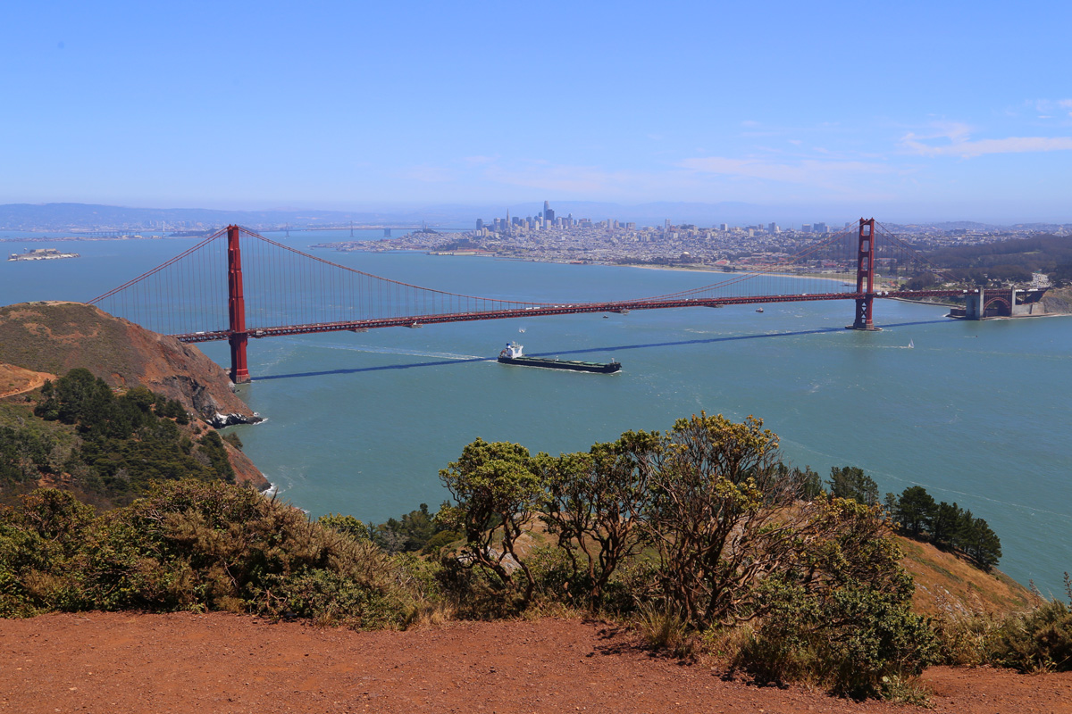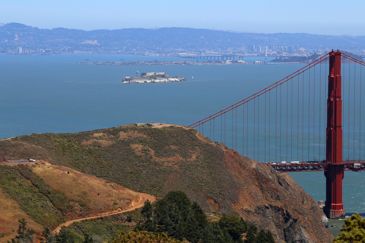 사실 위기주부는 다시 샌프란시스코를 방문하게 되면 저 바다 위에 떠있는 알카트라즈 섬을 둘러보는 투어를 꼭 하고 싶었지만, 이번에는 시간도 부족했지만 무엇보다 국립공원청의 투어가 중단된 상태였다. 위쪽에서 금문교 구경을 마치고 내려가면서 사진 가운데 보이는 언덕인 배터리스펜서(Battery Spencer)에도 들렸다.