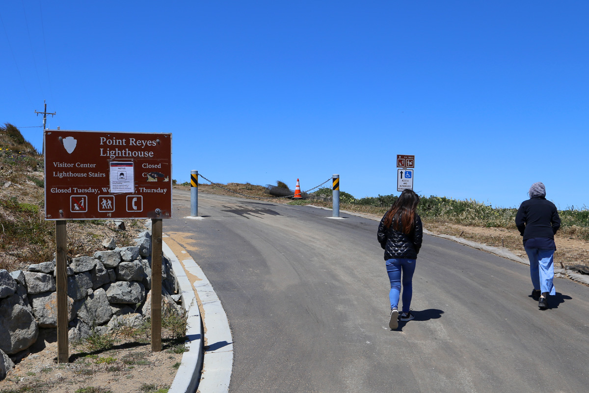 이 도로를 따라서 걸어가면 간이 비지터센터가 나오고 거기서 320개의 계단을 내려가면 포인트레예스 등대(Point Reyes Lighthouse)가 나오는데, 이 날은 목요일... 비지터센터도 닫았고 계단을 따라 내려갈 수도 없다고 안내판에 나와있다! 사실 다녀오려면 시간이 제법 걸릴 것 같아 고민했던 가이드는 차라리 잘 됐다는 생각으로 앞에 걸어가는 두 손님을 불러 세웠다. (멋진 등대의 모습을 보시려면, 역시 전편과 마찬가지로 퀵실버님의 여행기를 클릭해서 보시기 바람)