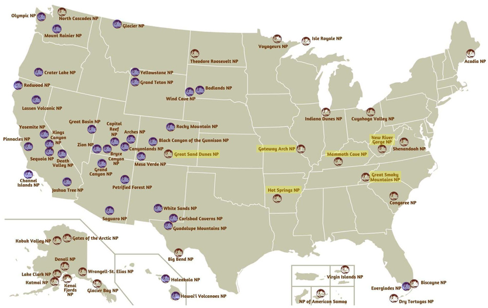 위의 지도는 2021년 10월 현재 미국땅의 63개 국립공원(National Park)의 위치들을 모두 표시한 것으로, 위기주부가 이미 방문한 35곳은 동그라미를 파랗게 색칠을 해놓았다. 이름을 노란색으로 표시한 아직 못 가본 6곳의 국립공원들이 중부 내륙에 있어서, 이번에 이삿짐을 싣고 대륙횡단을 하면서 방문하는 것이 여행의 주목적이다. 비교적 짧은 일정의 1차 횡단에서 아래쪽의 2곳을, 긴 일정의 2차 횡단에서 위쪽의 4곳을 방문하는 것으로 기본계획을 세웠다.