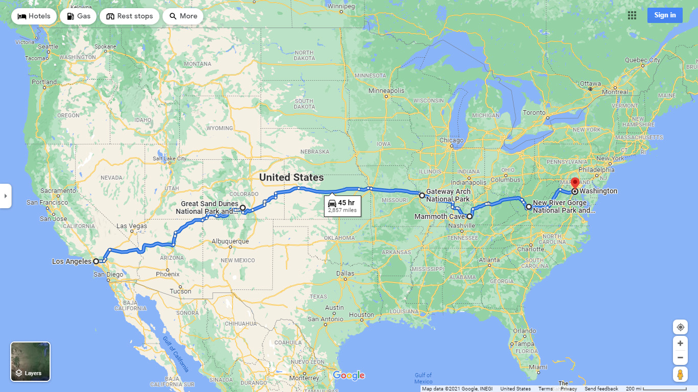 2차 횡단은 버지니아에서 집과 관련된 일을 처리한 후에 비행기로 LA로 돌아와, 다시 차를 몰고 출발해야 하기 때문에 일정이 매우 유동적이다. 따라서 대략 2주 정도의 기간이 가능할 것으로 가정하고, 일단 아래와 같이 4곳의 국립공원을 경유하는 경로만 대강 그려본 상태이다.