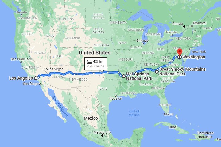 1차 횡단은 구글맵에서 자동으로 계산되는 LA에서 DC까지 두 도시간의 최단경로에서 아래와 같이 크게 벗어나지 않는다.