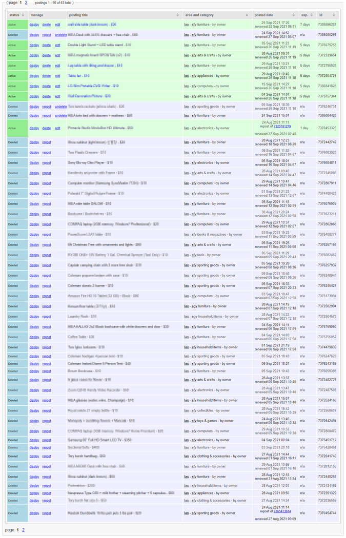 뜬금없이 무슨 표냐고 하시겠지만, 바로 8월말부터 미국의 중고거래 사이트인 크랙리스트(Craiglist)를 통해 처분한 목록으로, 8월말부터 올린 63개 중에서 출발 10여일을 남겨두고 소파, TV, 피아노를 포함해 55개 물품을 처분 완료했고, 최종적으로 냉장고와 안방 침대 등도 이 리스트에 추가되었다.