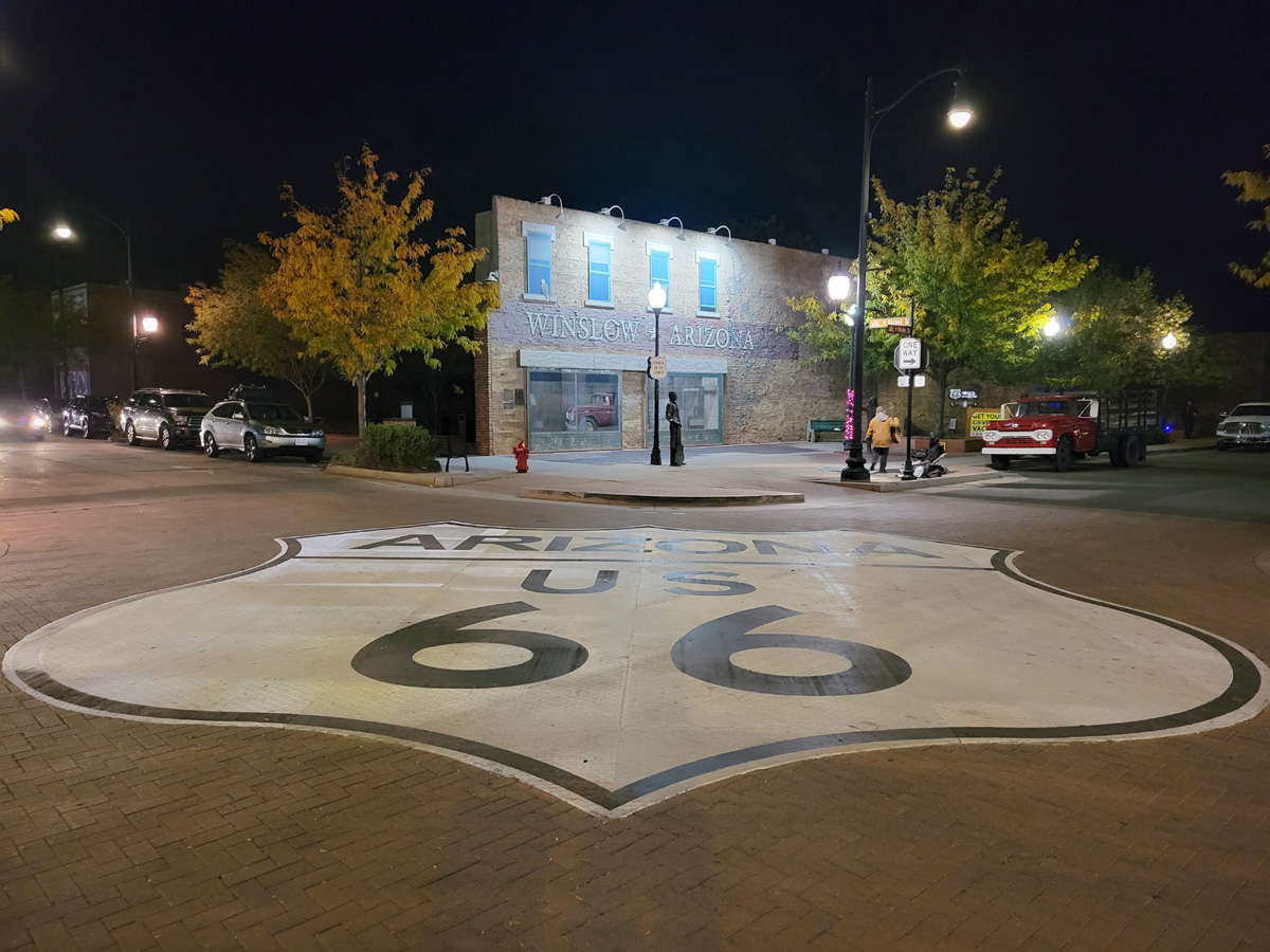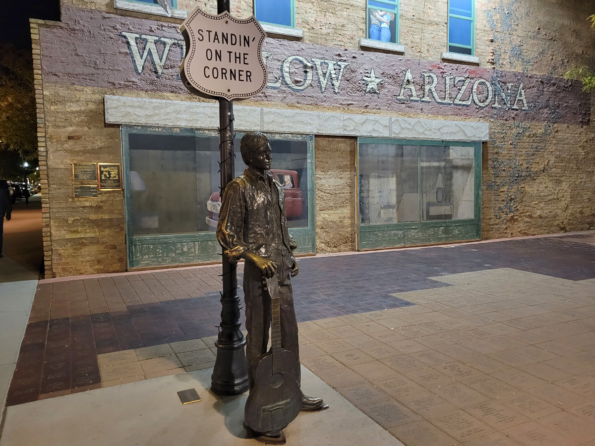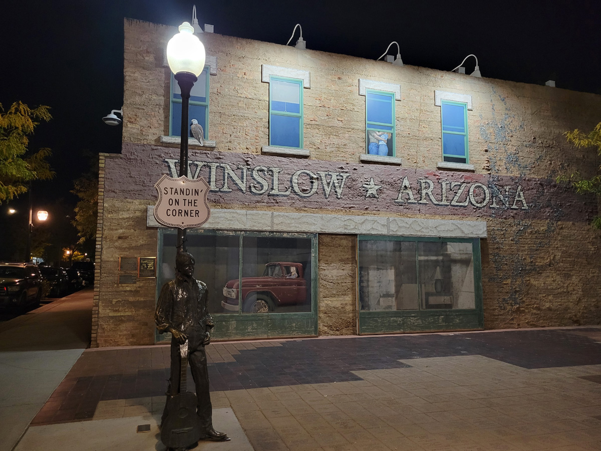 플래그스태프(Flagstaff) 동쪽에 있는 거대한 '운석 분화구'인 미티어크레이터(Meteor Crater)를 지나면 윈슬로(Winslow)라는 아리조나의 작은 마을이 나온다. 그 곳에는 그룹 이글스(Eagles)의 1972년 노래 <Take It Easy>의 노랫말에 등장해서 유명해진 장소인 스탠딩온더코너(Standin' on the Corner)라는 곳이 있다. (구글맵으로 위치를 보시려면 클릭)
