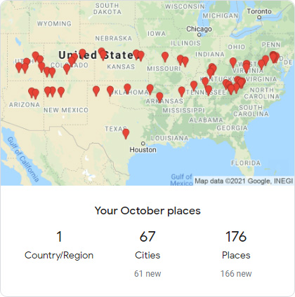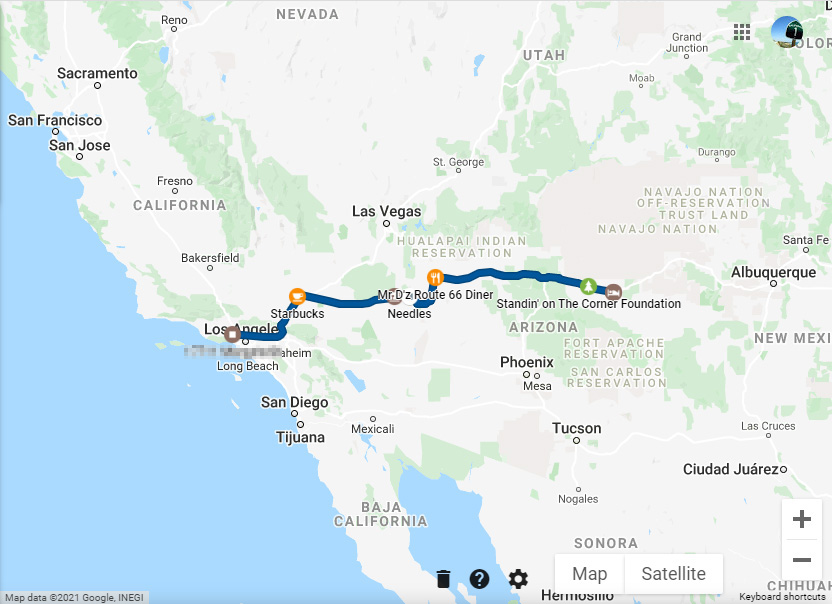 두 번의 미국 대륙횡단 여행의 이야기를 어떻게 시작하는 것이 좋을까 고민하다가, 지난 한 달간 위기주부의 행적을 보여주는 구글맵 타임라인(Google Maps Timeline)의 지도가 떠올랐다. 미대륙을 가로지르는 두 개의 경로가 동서로 대강 보이는데, 아래쪽이 1차 횡단이고 위쪽이 2차 횡단이다. (제일 아래 텍사스 가운데 찍힌 곳은 중간에 LA로 돌아가는 비행기가 잠시 경유했던 오스틴(Austin) 공항) 그럼 1차 횡단의 첫날 이야기로 위의 지도 왼편 아래쪽의 아리조나 주에 표시된 곳을 방문한 이야기로 대장정의 막을 올려보자~