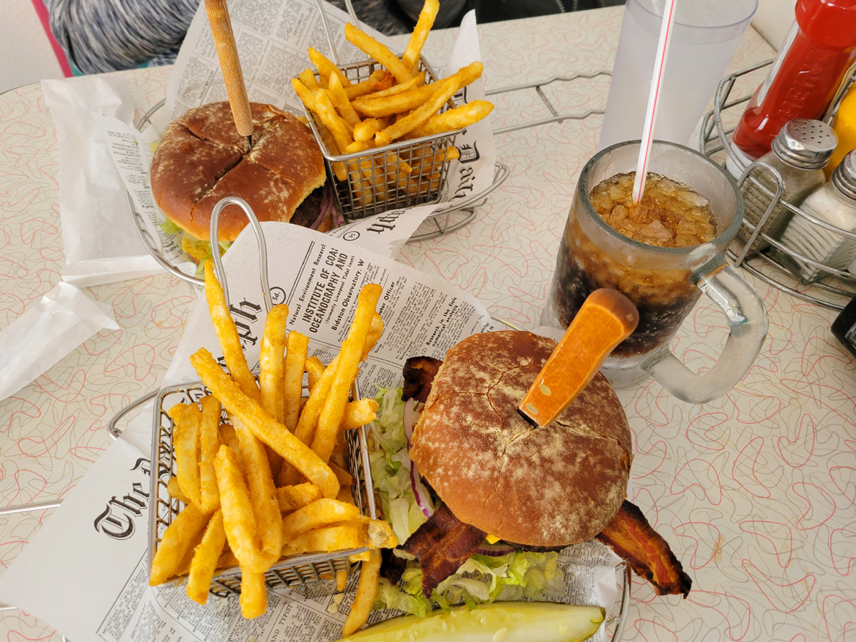이번에는 잊지않고 이 집의 명물이라는 오른쪽에 빨대가 꽂혀있는 얼음 둥둥 루트비어를 한 잔 시켰다. 입맛 까다로우신 사모님도 루트비어와 버거 모두 만족스러운 맛집으로 인정을 해주셨다.