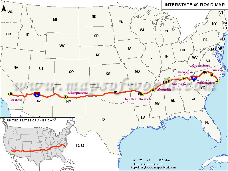 40번 고속도로의 전체 구간을 보여주는 지도로, 우리는 중간에 관광지를 찾아가기 위해 몇 번 우회한 것을 제외하면 1차 대륙횡단은 거의 이 고속도로를 따라 동쪽으로 달렸다고 할 수 있다. 물론 대서양을 만나는 동쪽 끝까지 간 것은 아니고, 노스캐롤라이나 초입의 애쉬빌(Asheville)에서 북쪽으로 방향을 틀어서 버지니아(Virginia, VA)로 올라갔지만 말이다.