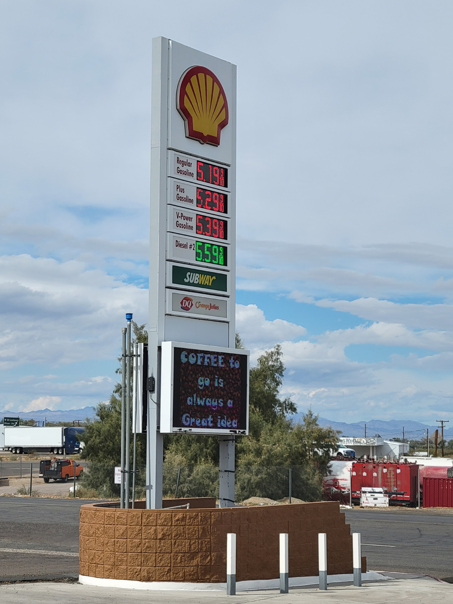 우리가 자동차로 두 번의 대륙횡단을 했던 지난 10월은 미국 역사상 기름값이 가장 비쌌던 달로 기록되었단다...T_T 사고로 한 시간 정도 지체되는 바람에 할 수 없이 기름을 조금 넣어야 했던 니들스(Needles) 주유소의 당시 가격 전광판인데, 안 그래도 기름 비싼 캘리포니아에서도 1달러 이상 비싸게 파는 곳으로 유명한 도시라서, 갤런당 가격이 5달러를 훌쩍 넘은 곳에서 주유한 기념(?)으로 사진 한 장 남겼다. 흑흑~